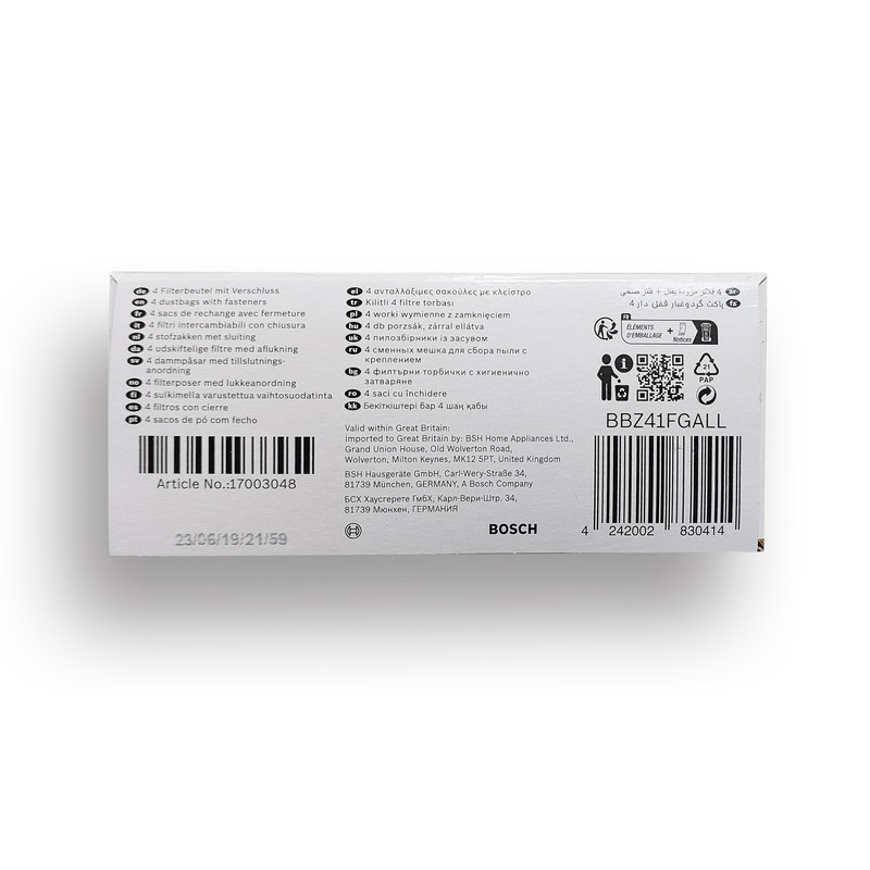 کیسه جاروبرقی بوش مدل GALL کد 17003048 مناسب برای جاروبرقی های بوش و زیمنس بسته چهار عددی