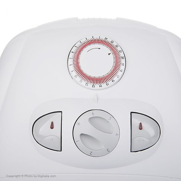 در قسمت بالایی دستگاه یک تایمر قرار دارد. پیشفرض تایمر، 24ساعته طراحی شده است. عملکرد تایمر این محصول بسیار دقیق است؛ بهطورمثال اگر بخواهید دستگاه بین ساعتهای 4 تا 5 بعدازظهر کار نکند، دکمههای قرمزرنگ و کشویی روی تایمر را، در این بازهی زمانی، به سمت خارج فشار دهید.